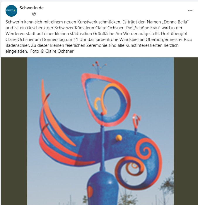 Schwerin.de freut sich: „Schwerin kann sich mit einem neuen Kunstwerk schmücken. Es trägt den Namen „Donna Bella“ und ist ein Geschenk der Schweizer Künstlerin Claire Ochsner. Die „Schöne Frau“ wird in der Werdervorstadt auf einer kleinen städtischen Grünfläche Am Werder aufgestellt. Dort übergibt Claire Ochsner am Donnerstag um 11 Uhr das farbenfrohe Windspiel an Oberbürgermeister Rico Badenschier. Zu dieser kleinen feierlichen Zeremonie sind alle Kunstinteressierten herzlich eingeladen.“