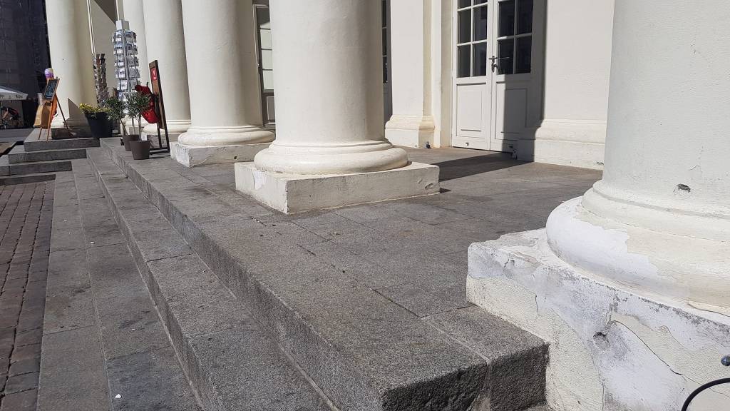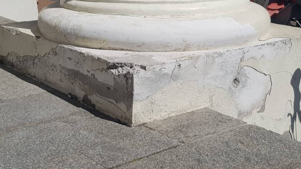Seit einigen Monaten sind die Plinthen des Säulengebäude auf dem Markt in einem alles andere als ansehnlichen Zustand. Eine Anfrage an den Oberbürgermeister, wie die Stadt den Zustand einschätzt und wie es mit Sanierung/Sicherung der Bausubstanz des Gebäudes aussieht blieb bisher gänzlich unbeantwortet. Ein Maurer bestätigte uns, dass der Zustand, wenn er nicht behoben wird, auf Dauer die Struktur Schädigen könnte.