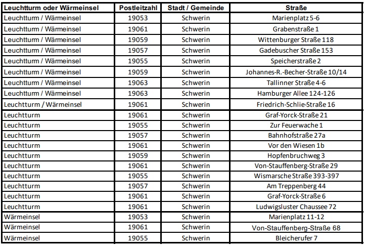 Die Planungen in den Landkreisen, Städten und Gemeinden für die Wärmeinseln und die Leuchttürme gingen weiter, so Pegel. „Wir haben einen guten Arbeitsstand erreicht, den wir auf der Internetseite den Menschen gern zur Orientierung in ihrer Umgebung vorstellen möchten. Die Planungsprozesse gehen aber weiter, so dass sich auch in den kommenden Wochen immer mal wieder ein Blick auf diese Seite lohnt, weil sich im weiteren Arbeitsprozess sicherlich weitere Standorte ergeben werden“, kündigte der Minister an und wies zugleich darauf hin: „Es kann an diesen Standorten keine Wärmeinsel und kein Leuchtturm besichtigt werden. Sie werden nur im Falle einer tatsächlich eintretenden Energiemangellage aktiviert.“