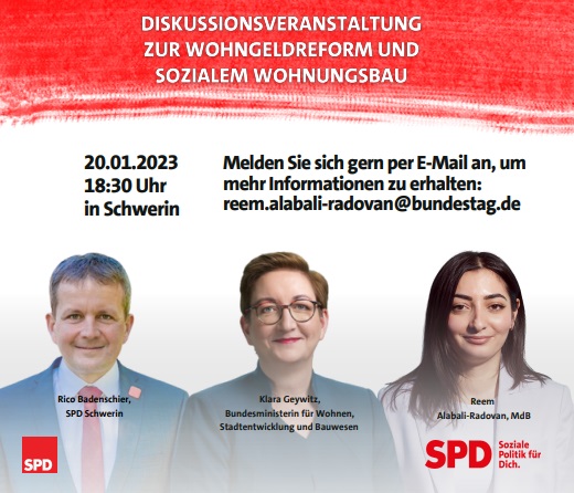 Am 20. Januar 2023 diskutiert die SPD-Bundestagsabgeordnete Reem Alabali-Radovan gemeinsam mit Dr. Rico Badenschier (SPD) und der Bundesministerin für Wohnen, Stadtentwicklung und Bauwesen der Bundesrepublik Deutschland Klara Geywitz (ebenfalls SPD) über all diese Themenfelder und wir sind gespannt darauf, welche Fragen, Hinweise, Ideen, Vorschläge und welche Kritik Sie vielleicht an uns richten.