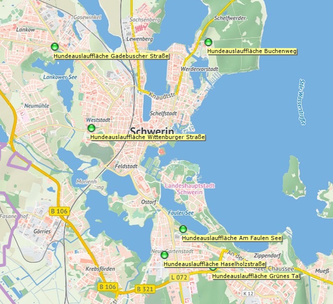 Die Landeshauptstadt Schwerin hat sechs Hundeauslaufflächen eingerichtet. Zur notwendigen Ausstattung zählen Hinweisschilder, Papierkörbe und Tütenspender zum Aufnehmen von Hundekot. Auf den ausgewiesenen Grünflächen können sich Hunde frei und ohne Leinenzwang bewegen. Von den nicht angeleinten Hunden darf jedoch keine Gefahr für das Leben oder die Gesundheit anderer Menschen oder Tiere ausgehen.