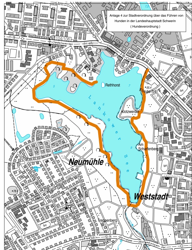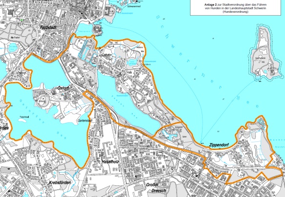 Es gibt bestimmte Gebiete und Stadtteile, in denen alle Hunde an der Leine geführt werden müssen. Dazu gehören Altstadt, Feldstadt, Paulsstadt, Schelfstadt, Ostorf und Zippendorf sowie die Naherholungsgebiete um den Ziegelinnensee und innerhalb eines 50 Meter breiten Streifens um den Ostorfer und Lankower See. Die genauen Begrenzungen dieser Gebiete sind auf Lageplänen ersichtlich (Auch hier abrufbar)
