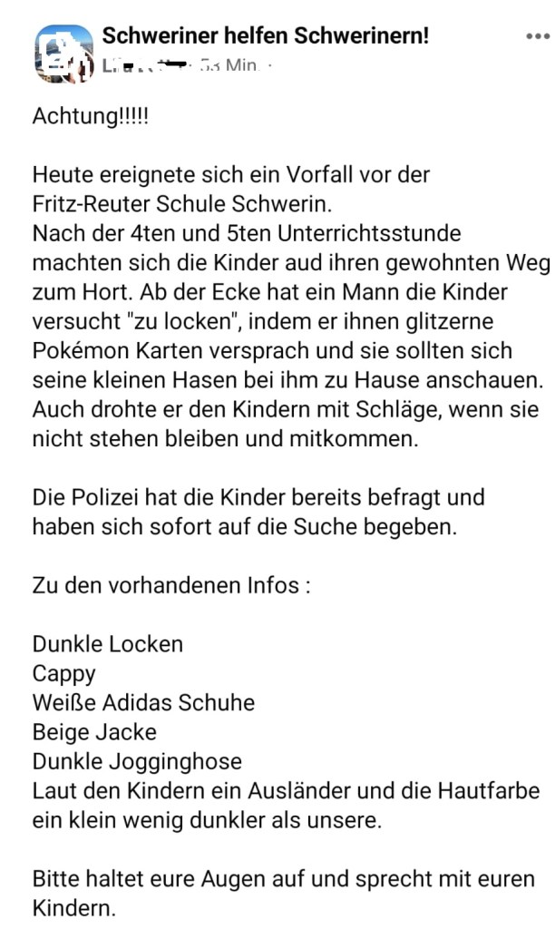 Seit 2 Tagen wird in den Sozialen Medien im Schweriner Raum ein Screenshot / Beitrag geteilt und verbreitet, der vor einem Mann warnt, der vor der Fritz Reuter Schule in Schwerin Kinder angesprochen haben soll. Es soll sich dabei um einen ausländisch aussehenden Mann gehandelt haben. Das entsprechende Facebook Posting beschriebene, erwies sich nun im nachhinein als deutlich weniger brisant als dargestellt.