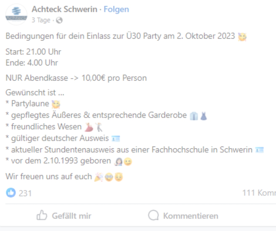 (stm/ Kommentar) Am 02. Oktober wird das Achteck Schwerin eine Ü30 Party veranstalten. Das Echo auf die Ankündigung war groß und bisher weitestgehend positiv.