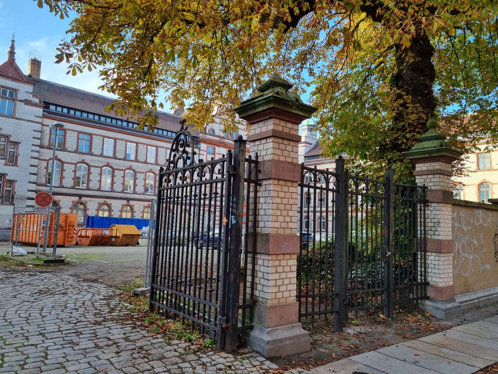 Ja, der Denkmalschutz erstreckt sich auf die Mauer entlang der Bischofstraße. Ursprünglich waren zwischen den Mauerpfeilern Gitter vorhanden, ähnlich dem Gitter an der Torzufahrt in der Mecklenburgstraße. Das Wärterhäuschen hingegen ist ein nachträglicher DDR-Anbau am Nordflügel des Hauptgebäudes und genießt keinen Denkmalschutz.