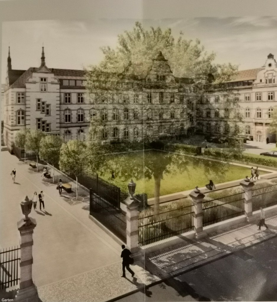 Das Gebäude der ehemaligen Hauptpost in Schwerin wird aktuell saniert. Auf einem Entwurf ist zu erkennen, dass die Mauer, die rückseitig gegenüber des Domes die Begrenzung zum Gelände der ehemaligen Hauptpost darstellt, durch einen Zaun ersetzt werden soll.