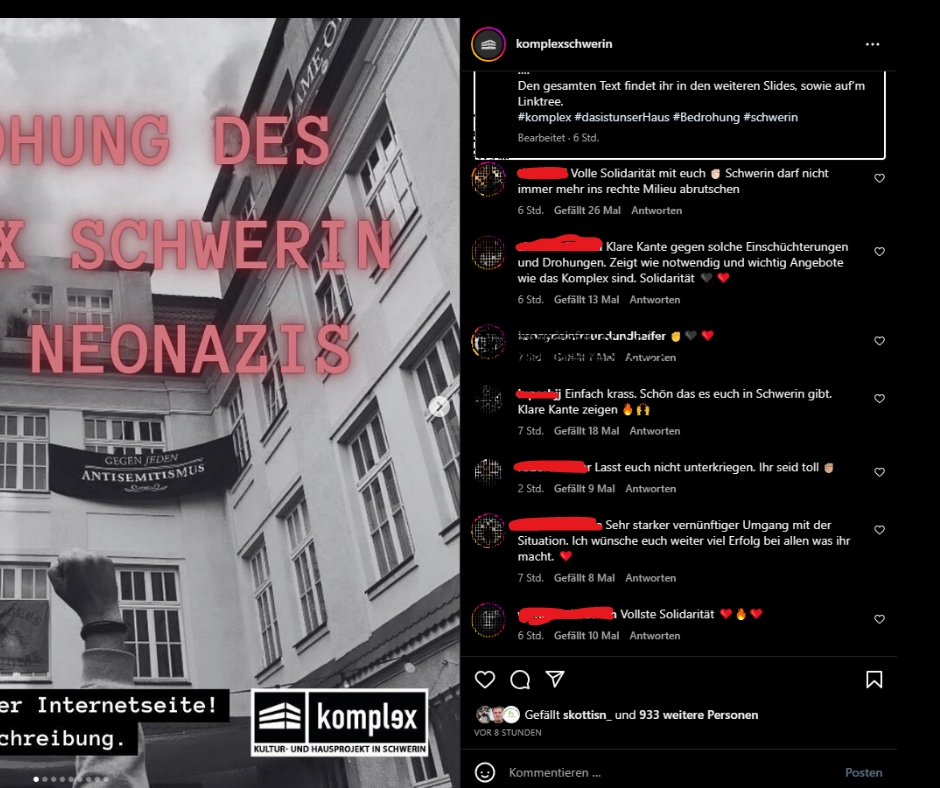Trotz der ernsten Bedrohungslage lassen sich die Bewohnenden nicht einschüchtern. Die Solidarität in der Schweriner Bevölkerung und darüber hinaus ist deutlich spürbar. Zahlreiche Kommentare auf dem Instagram-Beitrag des Komplex zeigen Unterstützung und klare Positionierungen gegen rechte Gewalt. Die Bewohnenden betonen, dass sie sich nicht beirren lassen wollen.