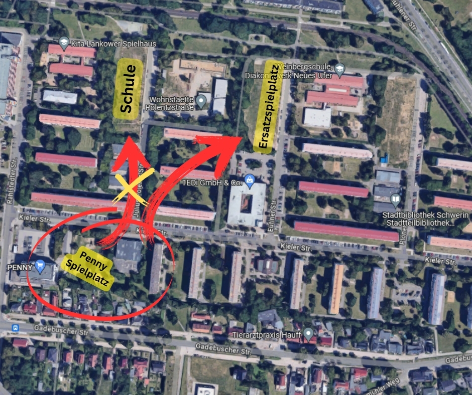 Der Ersatzspielplatz verzögert sich nach Angaben der Stadtverwaltung aber noch etwas, denn die Kosten, die der Herr Stein, dem das Penny Gebäude gehört, für den Ersatzspielplatz tragen muss waren ihm zu hoch, sodass eine neue Planung notwendig wird, oder die Stadt Schwerin die gestiegenen Kosten tragen muss. Eine Entscheidung dazu steht nach http://www.schwerin.news Informationen noch aus.