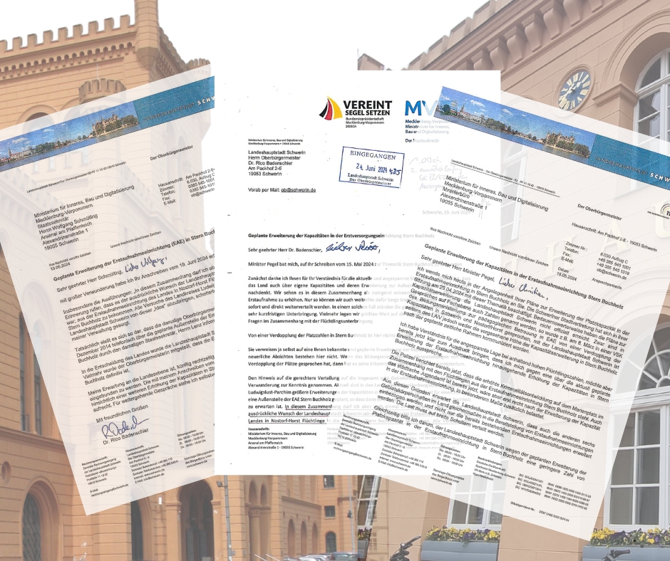 (stm) Artikel als Audiodatei, stark verkürzt und in „Einfacher Sprache“: In einem Nachtrag eines Protokolls des Hauptausschusses, das die Stadt Schwerin vor wenigen Tagen veröffentlich hat, lässt sich ein interessanter und seltener Einblick in die „Kommunikation“ zwischen Oberbürgermeister Dr. Rico Badenschier und dem Innenministerium zur Erhöhung von Kapazitäten in der Erstaufnahmeeinrichtung Stern Buchholz entnehmen. Die … Kapazitätserweiterung Erstaufnahmeeinrichtung Stern Buchholz: Dokumente enthüllen Kommunikationsdefizite zwischen Stadt und Land weiterlesen