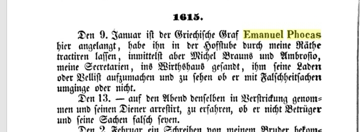 In dem Buch namens: „GRANDES FAMILLES DE GRECE, D’ALBANIE, ET DE CONSTANTINOPLE“ (Adligen, die aus Konstantinopel geflohen sind) findet sich folgender Eintrag: „…et Emmanuel Phocas, avec les leurs…“