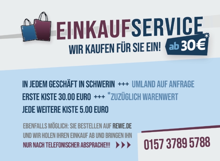 Nach einer telefonischen Absprache (mindestens 24 Stunden vorher) übernimmt das Team des Drahtesel Kuriers den Einkauf oder die Abholung Ihrer Bestellung. Ob von lokalen Märkten, wie dem Rewe-Center, oder anderen Geschäften in Schwerin – der Service ist flexibel und individuell planbar.