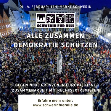 Um gegen diese Entwicklung ein Zeichen zu setzen, ruft Schwerin für alle zur nächsten Dienstagsdemonstration auf. Die Kundgebung soll unter dem Motto „Alle zusammen – Demokratie schützen!“ stehen.