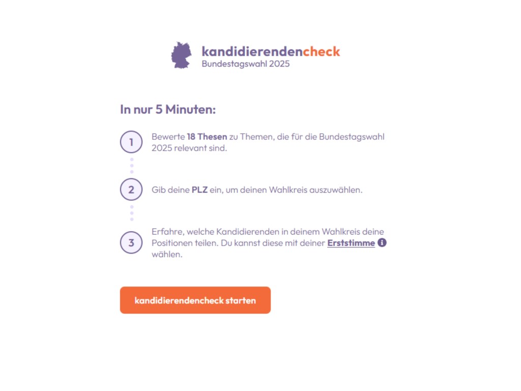 Ein Hilfsmittel für die Erststimme: Nutzer:innen beantworten 18 Thesen, geben ihre Postleitzahl ein und sehen, welche Direktkandidierenden aus dem Wahlkreis ähnliche Positionen vertreten. ✔ Nur im Browser verfügbar ✔ Zwei Drittel der Kandidierenden haben teilgenommen ✔ Betreut von abgeordnetenwatch.de