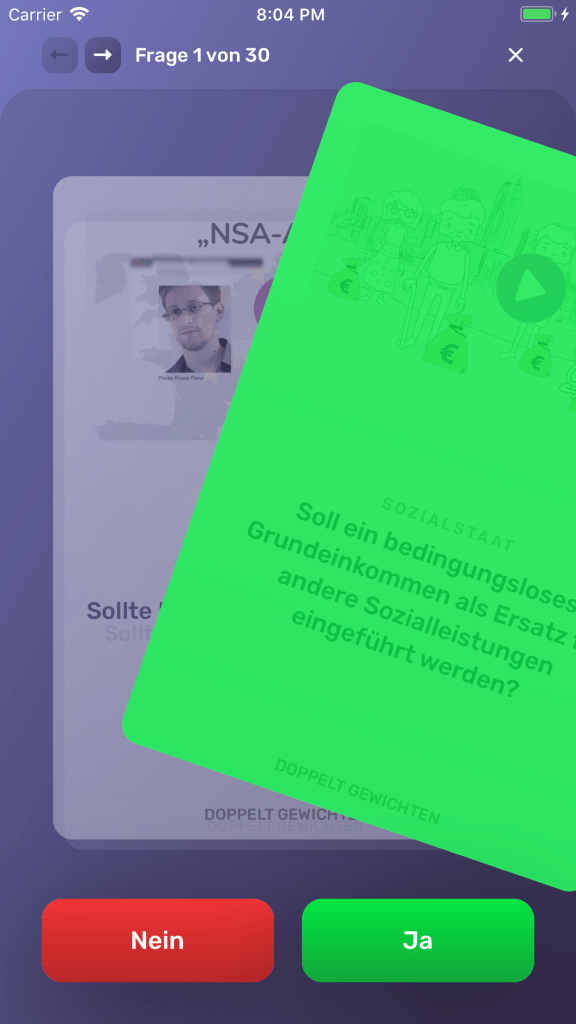 Ähnlich wie eine Dating-App: 38 Fragen werden mit Wischbewegungen beantwortet („Ja“ nach rechts, „Nein“ nach links). ✔ Verfügbar als App und im Browser ✔ Einfach und intuitiv ✔ Entwickelt in Kooperation mit der Uni Freiburg