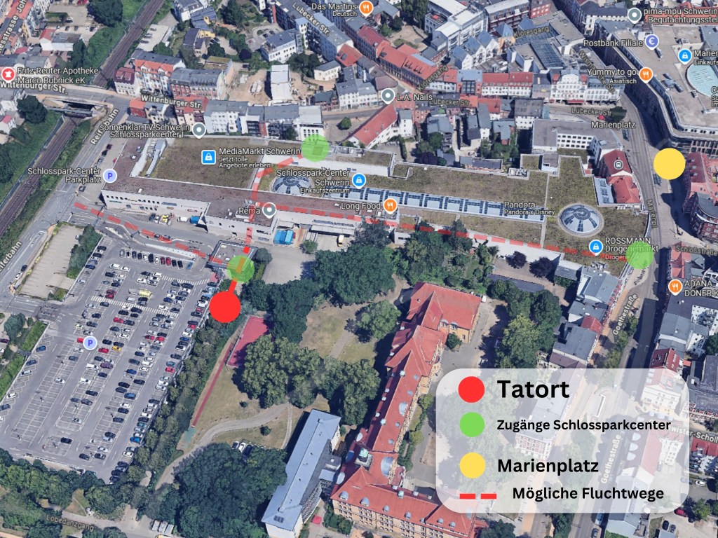 🔹 Tatort & Ablauf: Die Auseinandersetzung begann im Schlosspark-Center und verlagerte sich in den Ausgangsbereich Richtung Lobedanzgang, wo der Jugendliche mit mehreren Meserstichen niedergestochen wurde.