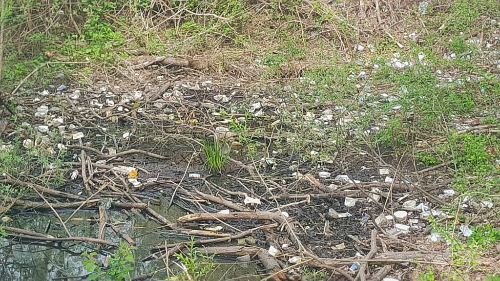Der angrenzende Teich. Auch dort schwimmt Plastikmüll.