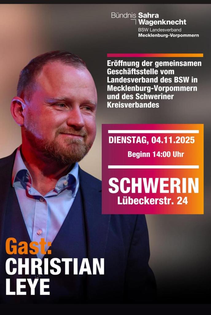 Der Landesverband des Bündnis Sahra Wagenknecht (BSW) in Mecklenburg-Vorpommern und der Schweriner Kreisverband beziehen eine gemeinsame Geschäftsstelle in der Landeshauptstadt. Die Eröffnung findet am Dienstag, 4. November 2025, in der Lübecker Straße 24 statt. Beginn ist 14 Uhr.