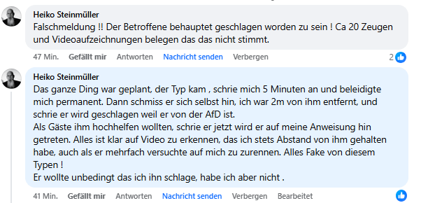 Unter unserem Facebook-Beitrag äußerte sich nun Steinmüller selbst, räumt mit den Spekulationen auf und schilderte eine völlig andere Version. Demnach sei die Situation „geplant“ gewesen: Ein Mann habe ihn minutenlang angeschrien und beleidigt. Er behauptet, der Mann habe sich anschließend selbst fallen lassen und dann lautstark behauptet, wegen seiner (angeblichen) AfD-Nähe geschlagen worden zu sein. Steinmüller schreibt zudem, es gebe Videoaufnahmen und zahlreiche Zeugen, die seine Darstellung stützten – er habe Abstand gehalten und nicht zugeschlagen.