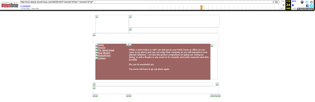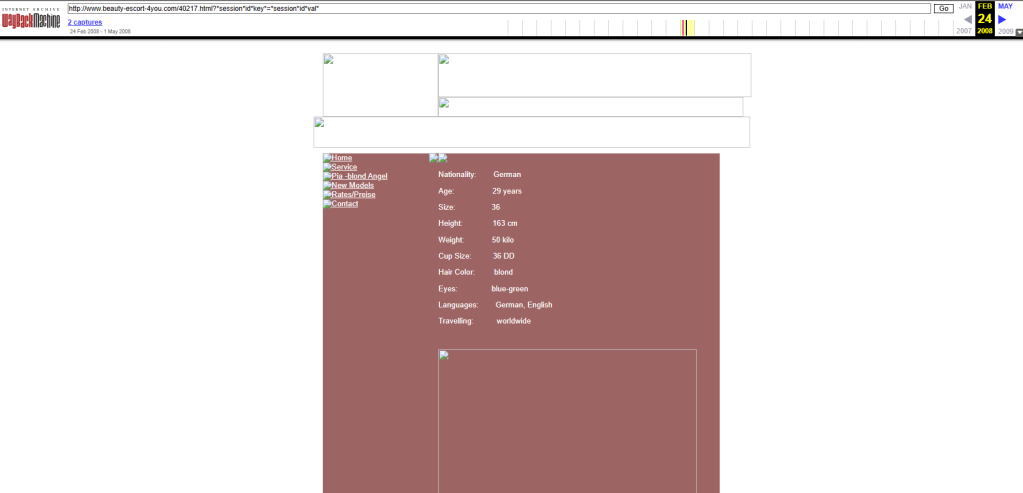 Was diese Recherche nun zum ersten Mal öffentlich dokumentiert: archivierte Originalseiten der Website beauty-escort-4you.com vom 24. Februar 2008. Diese Seiten waren bisher nicht öffentlich ins Vesier genommen worden. Medienberichte hatten stets die.de-Domain zitiert, die laut Wayback Machine (Internetseite, die Vorgängerversionen einer Internetseite abrufbar macht) keinerlei Archivspuren hinterlassen hat. Die .com-Variante hingegen wurde von der Wayback Machine an zwei Zeitpunkten — 24. Februar 2008 und 1. Mai 2008 — archiviert. Mehrere Unterseiten sind vollständig erhalten. Wir haben sie gefunden. Wir haben sie gesichert. Und sie zeigen mehr, als bisher bekannt war.